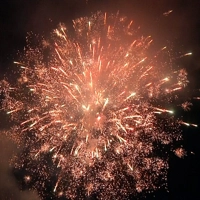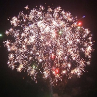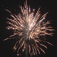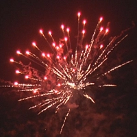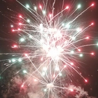 Красные мерцающие пионы, пурпурные хризантемы в золотом треске, разбегающиеся рыбки, красно-синие пионы, трещащие сферы с зеленым пестиком, разноцветные мерцающие пионы. Финал — красная хризантема в золотом треске.