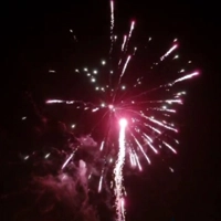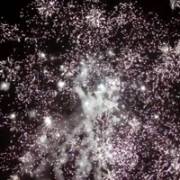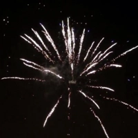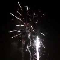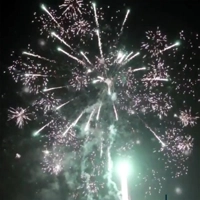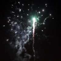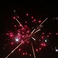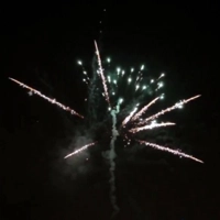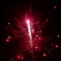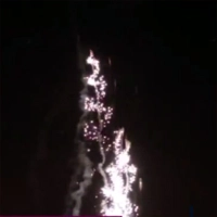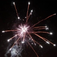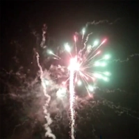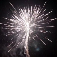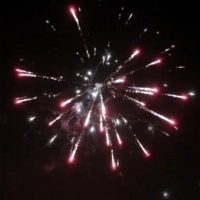 Эффект: двухуровневый салют: Вверху - золотые хвосты с красными;;огнями в центре с мерцанием и треском, внизу - трещащие и мерцающие огни.