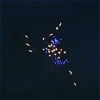 Как настоящий звездопад предстает перед нами этот необычный салют. Объемные золотые цветы рассыпают на небо чашу мерцающих звезд. Необычным дополнением является букетик из синих мерцающих незабудок с разлетающимися в разные стороны белыми лепестками.