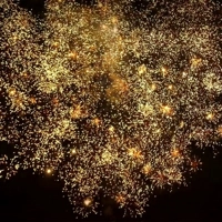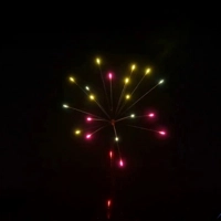 Пионы распускаются в небе, их нежные лепестки переливаются всеми оттенками розового и пурпурного, создавая ощущение весеннего цветения. Затем появляются пальмы, словно танцующие под ритм музыки — их силуэты грациозно качаются, а вокруг них разлетаются хризантемы, сияющие золотистыми и белоснежными оттенками, как искрящиеся звезды на фоне темного неба.