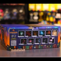 Первый залп поднимает в небо золотые ивы, словно нежные струи света, которые плавно опускаются вниз, а вокруг них расцветают зеленые звезды, создавая атмосферу волшебства и загадки. Эти искрящиеся огни словно уносят вас в мир сказок.